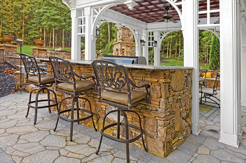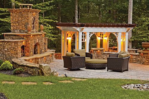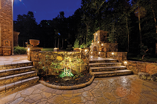 Retaining Walls, Steps & Walkways Although the front of the house was not part of the re-design, the side of the house received a retaining wall and set of steps where the driveway and side of the house meet. Three steps up from the driveway is a walkway made of Mega Arbel with curbstone edging. This walkway leads to the entertaining patio with fireplace, which is made from the same stone. The second walkway is made of eight natural Tennessee fieldstone steps, and leads patrons away from the fireplace and entertaining patio to the 20-foot by 40-foot pond, which already existed on the property. Although the pond was not part of the re-design, it did receive 17 bullet, path and underwater fixtures. A second set of steps, made from natural Tennessee fieldstone with Versalok bullnose treads, leads from the entertaining patio with fireplace down to the secondary patio that has a pergola-covered kitchen with bar and a dining area that seats eight. The all-wood, 14-foot by 14-foot pergola, finished and painted in white is lit with four uplights and four backsplash lights. Entertaining Patio The entertaining patio with fireplace is made from Belgard Mega Arbel stone, while the 11-foot-tall and 7-foot-wide fireplace is made from natural Tennessee fieldstone. The fireplace is equipped with two wood storage boxes, one on each side of the center hearth. The Final Touches To create the outdoor kitchen and bar, granite countertops were added to the natural Tennessee fieldstone structure that encloses the grill, which the clients already owned. Clarolux light fixtures, which are made in the USA, were utilized to illuminate the hardscape area, landscaping, and pond. More than 70 fixtures were used, including uplights, wall lights, grill lights, and bullets, all of which are linked to an automated, dimmable system that can be controlled from a computer or phone. The project had several challenges, beginning with the grading issues, however this was easily fixed by designing multiple retaining walls into the plan. Many of these walls also include seat walls for entertaining purposes. The project was also done during the winter months, so inclement weather was another challenge. Although new plants were incorporated into the design, this was something the homeowner decided to do as a DIY project.