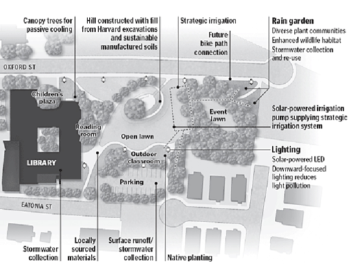 Native plants in a ?EUR??,,????'?????<????????rain garden?EUR??,,????'?????<????????????EUR??,,???EUR??,,????'?????<????????????EUR??,,?? will help filter rainwater through the soil to a holding tank with a solar-powered irrigation pump that will be used to maintain plants, lawns, and trees. The tank will also be fed with rainwater collected from the library?EUR??,,????'?????<????????????EUR??,,??s roof. Meanwhile, solar-powered lights will line a quarter-mile of walking paths.