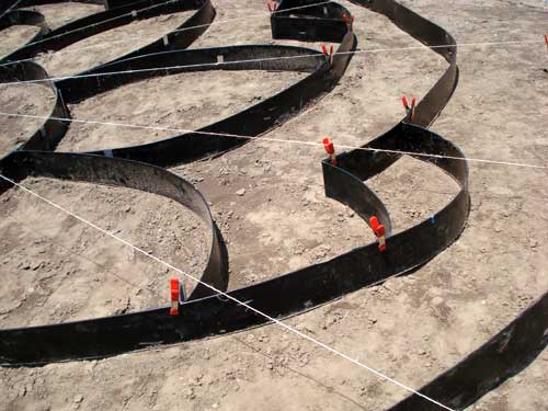 The quilt is beautiful, but a landscape profession looking at it would want to know how the patchwork pattern holds its shape against the landscape's 40-degree slope. Traditionally, string is used to layout the pattern for planting Wellfield's flowerbeds, but the circular pattern of the Hearts of Hope and the slope necessitated more support, in this case a black vinyl (PVC) landscape edging (Super-Edg by Oly-Ola).