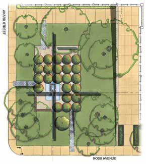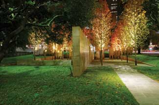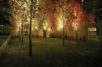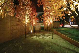 As lighting for the October Glory maple trees in the plaza, they used Greenlee BAS fixtures that are small and are mounted to the trunk of the tree at the first branching of the tree. There is only per tree and all are mounted on the same side of the tree. That light is incandescent and shines upward into the trees. The trees are 12 feet high on center and they provide enough glow or light for the plaza and courtyards. They are metal halides and those are the only lights for inside the plaza. All the ballast and electrical boxes are below grade junction boxes and ballast, which are located under the gravel so they could be located in the plaza itself. The runnel is not lit, however the existing, overhanging live oaks are lighted which adds a soft moonlit glow from the perimeter of the park. The only lights in the interior of the park are in the trees and the light on the fountain water display.