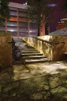 The two areas of staircases, one coming in off Ross and one off Akard street, have additional lighting. Those fixtures are Greenlee downlights placed in the existing large oak trees. For those they used DAS fixtures with metal halide lights.