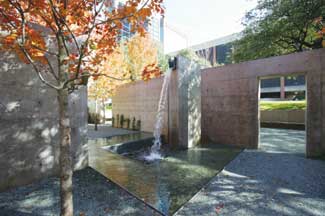 The size of the whole park 185 feet by 135 feet. The whole lighting design plan is fairly simple with halide yellow in the center while the perimeter is softer moonlight mercury vapor. At the base of the fall is a light, which is the only light for the water feature. There is no lighting on the runnel itself or on any of the walls either. Pebbles form the bottom of the upper tier of the fountain adjacent to the plaza level. It is the more reflective section and is only six-inches deep. The center portion is 18-inches below that, with a ballast of Pennsylvania bluestone. The water circulates down through the bluestone pebbles to the third tier, which is a basin where it re-circulates. The plumbing picks up the water, runs it through the filters and then back up to the runnel. In the top tier you see through the water to the round rocks below. The reflecting pool is on the outer perimeter and reflects the lighting at night and the glorious red of the maples during the day.
