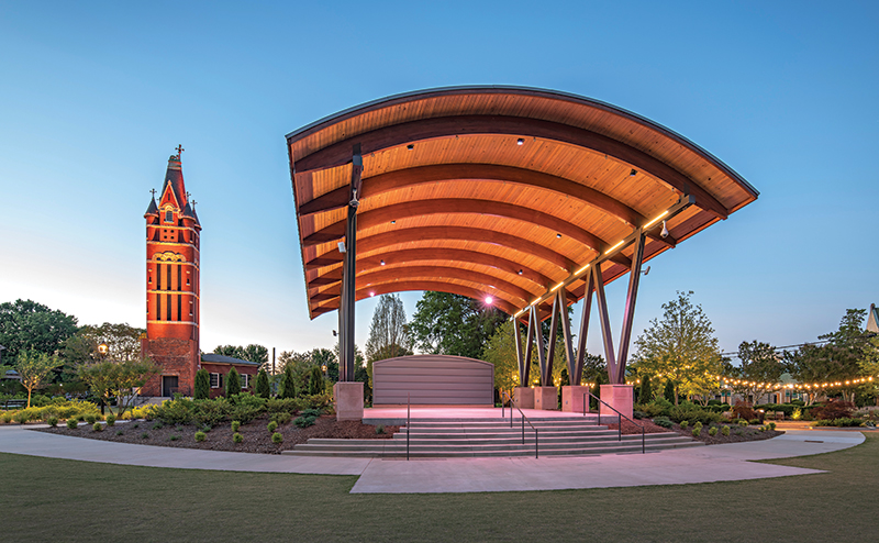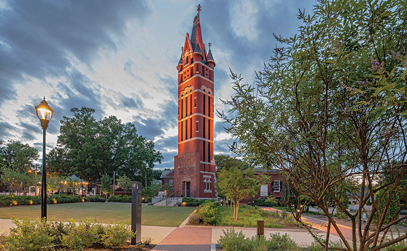 Downtown Salisbury, North Carolina, was recently enhanced with a much-needed park named Bell Tower Green. It is located on the grounds surrounding The Bell Tower, which was built in 1892 as part of the First Presbyterian Church and most recently bordered by a dilapidated parking lot. Besides the tower, the park encompasses two other historic structures. The first one is known as the Female Academy, which housed classrooms from 1820-1825, turned into a residence for local businessman Maxwell Chambers, then Dr. Josephus Hall and purchased by Historic Salisbury Foundation in 1972. Also on the grounds is the Sessions House, a Presbyterian Church meeting facility erected in 1855 over the gravesite of the Maxwell Chambers' family who donated the land. To illuminate the tower and site and make the space attractive and inviting at night, landscape architecture firm, LandDesign, teamed up with Hartranft Lighting Design, founded in 2013 by Andrea Hartranft after working as a lighting designer for 27 years. The company is based in Charlotte, North Carolina and has grown to 14 employees in eight different states. Principal Paula Ziegenbein, who started with the company in 2014 and became a partner in 2022, served as the lead designer for this project. Providing the Groundwork Funding for the three-acre park with wide-open green areas of turf surrounded by various plantings including numerous trees such as Serviceberry, Eastern Redbuds, Washington Hawthorns, Honey Locusts, Crape Myrtles, Tulip trees, Southern Magnolias, Black Gum trees and Chinese Elms was made available through $13 million of private donations from dozens of companies and non-profits and hundreds of individual citizens. Ziegenbein's design for most of lighting began in March of 2018 and took 13 months to be finalized. Then in 2020, the last piece of the plan, an illumination strategy for an outdoor stage that is situated near the middle of the park, was undertaken by Hartranft. Installation of the fixtures and accompanying accessories took place during the COVID-19 pandemic, which Hartranft recalls as not really adding any challenges since it was an outdoor project.