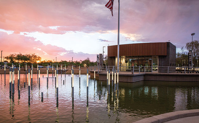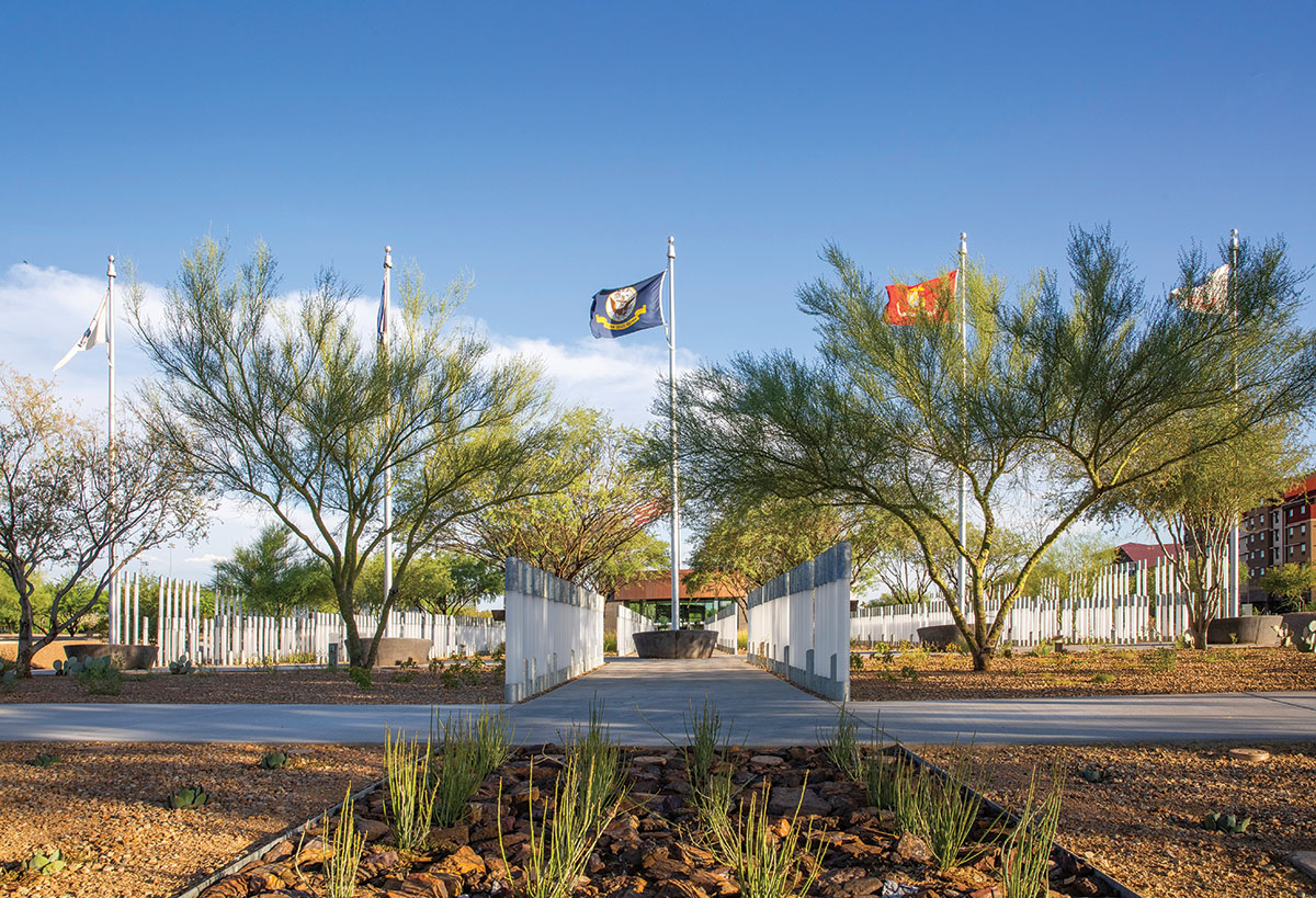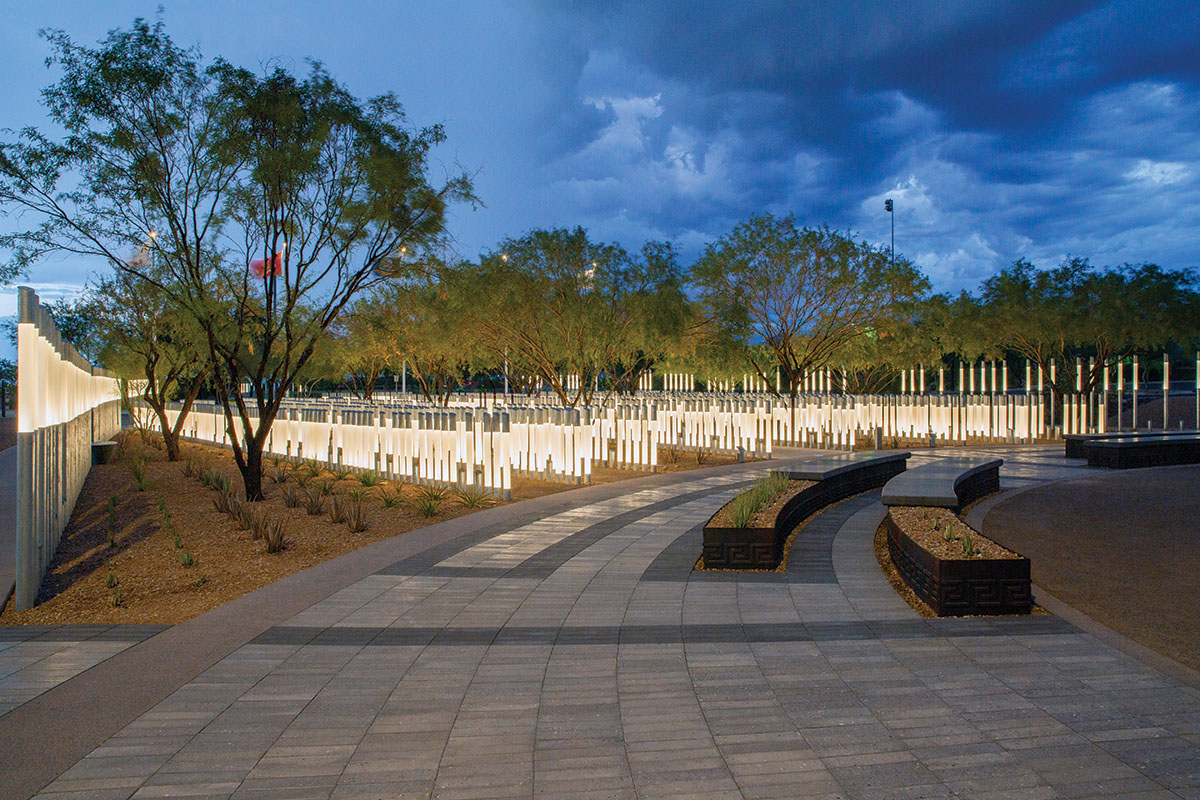 On December 7th, 1941, the Japanese infamously attacked the United States with a raid on Pearl Harbor. On that day 2,403 U.S. personnel, including 68 civilians lost their lives. Of those, 1,177 were aboard the USS Arizona. In 1951, the first memorial for the Arizona contained a 'Relic' of the original Boat House to the ship. In 1961, the Relic was relocated to a Naval yard allowing for the construction of the current USS Arizona Memorial in Pearl Harbor, where it sat until several members of the Salt River Pima-Maricopa Tribe got together to find a way to bring a piece of history to their community after their experience in Hawaii where they received a US flag that had been flown at that memorial. Many of the tribe leaders were veterans who discovered that in 1995 the federal government granted the US Navy the ability to remove pieces from the Pearl Harbor site, in what is called "The Relic Program," and provide those pieces to be used for memorial and educational services. So, they wrote to the Navy and were granted two pieces; a part of the USS Arizona's original boat house and the flag that stood at the masthead of the Arizona that December day in 1941, prompting the development of the USS Arizona Memorial Gardens at Salt River. The project was intricate and required great attention to detail, as the gravity of this development was felt by all involved. The thought-provoking planning process gave the community a project that allows this actual piece of the USS Arizona to take its honored place as a reminder of the historical events surrounding Pearl Harbor. Their memorial is the same length as the actual USS Arizona, with over 1,500 commemorative columns, each representing a life aboard the ship that day. The columns serve as a visual aid of the USS Arizona's outline while telling the profound story of the men aboard. 1,177 of the columns feature LED lights, representing those who died onboard, with the unlit columns representing the 1 in 5 shipmates who survived. Created from galvanized steel, the commemorative columns represent a unique life, showcased in their slightly different finished appearances due to the mottled galvanized coating. They will naturally patina over time to a duller, darker, and softer gray which will eloquently contrast with the frosted white lights held within them. When viewed in mass, visitors quickly understand the magnitude of the events on that fateful day. Each column subtly glows with light after sundown, transforming the memorial and invoking the thought that the brightness of each individual will continue to shine, and their sacrifice will stand the test of time.
