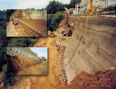Wolosick said the real breakthrough in the project design was when the team decided to take land away and then give it back in the form of a new wall. "Nobody had ever thought about digging some of the good dirt out, which is what we had to do. We actually dug 15 feet further back from the edge of the bluff. What that allowed us to do was to get our equipment in there on the ground instead of hanging it from cranes. So we could work on the ground, and that saved probably 50 percent of the project cost right there. We dug within a few feet of the front porches of these houses."