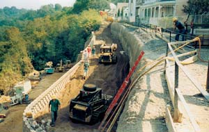 Phase 2 involved the construction of two lower retaining walls along Learned Mill Road, which had been eroded by 4 to 6 feet in places. At the lowest level, the design/build team constructed a 990-feet long wall, 32 feet in height.