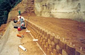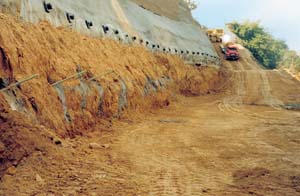 Hayward Baker used a technique called soil nailing to solve the problem. "You drill and grout steel bars into the ground to shore it up and then spray shotcrete over the face of the soil to keep it from eroding anymore," Wolosick said. "In addition, we also built a wall out into the air and we actually added land back to Natchez that had slid away. We built a mechanically stabilized embankment wall by using Keystone retaining wall.