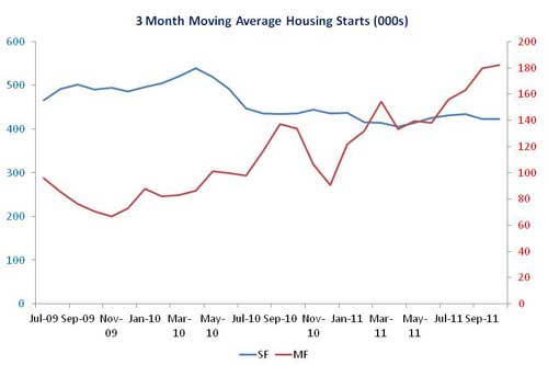 The drop in multifamily construction from the September level was an adjustment to an exceptionally large number in September. On a three-month moving average level, multifamily starts have been increasing for five months.