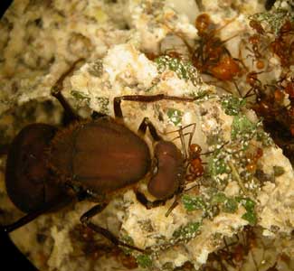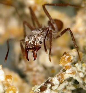 The fungus-growing ants, Currie notes, are technically herbivores. They make their living by carving up foliage and carrying it back to their nests in endless columns to provide the raw material for the fungus they grow as food. "But plant feeding insects are known to be nitrogen limited," explains Currie, "and the plant biomass nitrogen is lower than what the insects need for survival."