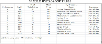As you can probably imagine, planting plans not hydrozoned properly make it nearly impossible to create an efficient irrigation plan. Why is this plan properly hydrozoned? Because this plan shows plants grouped by watering requirements and sun exposure. The corresponding table (shown below) displays hydrozone name, area, percent of total area, plant water requirements, hydrozone description and sun exposure. From this, anyone reviewing the planting plan and table, can easily see it is hydrozoned properly. Even an irrigation designer.