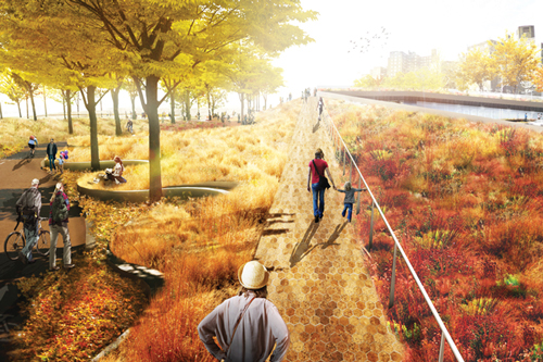 The 6 winning design proposals in HUD's Rebuild by Design competition are: The BIG U (East River Park), Manhattan "?u The BIG Team ($335 million) Living with the Bay (Slow Streams), Nassau County, Long Island "?u The Interboro Team ($125 million) New Meadowlands, Little Ferry, Moonachie, Carlstadt, Teterboro "?u MIT CAU+ZUS+URBANISTEN ($150 million) Resist, Delay, Store, Discharge, Hoboken, Weehawken, Jersey City "?u OMA ($230 million) Lifelines, Hunts Point, South Bronx "?u PennDesign/OLIN ($20 million) Living Breakwaters, Tottenville, Staten Island "?u SCAPE/Landscape Architecture ($60 million) The genesis of the HUD program was President Obama's Hurricane Sandy rebuilding taskforce efforts to "dramatically improve the physical, ecological, and economic resilience of coastal areas." The $920 million in HUD funds will finance additional planning, the design of flood protection via berms and wetlands. HUD is spending $60 million alone for the first large-scale experiments with creating reefs that can act as tide-surge mitigation. The winning project proposals come from teams representing some of the best planning, design and engineering talent in the world, including landscape architects, architects, engineers, ecologists and artists. The projects are spread throughout the region, with funding evenly split between New York and New Jersey. "These inventive proposals are a blueprint for how communities can maximize resilience as they rebuild and recover from major disasters," writes HUD. "These ideas will serve as a model for how we can mitigate the effects of climate change and natural disasters in communities throughout the Sandy region, the U.S., and the world." "It's my hope that Rebuild by Design will inspire other public-private partnerships to spur innovation and resilience in other parts of the country and around the world," said HUD Secretary Shaun Donovan. The Rockefeller Foundation has helped finance the design competition, and been a major player in this push for "resilience."