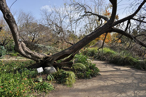 Out at the L.A. County Arboretum, the staff estimates some 300 trees destroyed. Some species, like the Engelmann oaks and 150-foot tall Mexican fan palms endured the winds with little damage, but stiffer species, such as the Elephantine ficus, snapped. The dry conditions, however, helped keep many trees from uprooting.