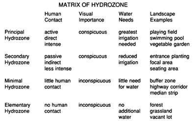 By differentiating the site into its principal, secondary, minimal, and elementary hydrozones, the designer or planner is able to put the water where it is needed and to avoid extravagant use of water in areas little used or appreciated. Inherent to the hydrozonic planning concept is the need to carefully evaluate the area required for each zone and to limit the size of the principal and secondary hydrozones (which consume the most water and energy) to what is absolutely necessary for the fulfillment of the designer’s program. The attached illustration shows a matrix used to evaluate potential hydrozones.