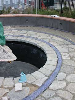 A bronze sculpture anchors the opposite end of the plaza. The female figure is climbing a vertical spiral atop a large shard of granite. The spiral reflects through the shape of the granite and onto the ground plane where a lighted Archimedean spiral uncoils its way through stone paving around the sculpture and into the next room of the park where it recoils as an equiangular spiral down to a small steel disk. The lighted spiral was fabricated using an aluminum channel embedded with three flexible clear conduits and recycled glass pebbles. A clear polymer resin commonly used by sculptors for molds was poured onto the pebbles to create a translucent and impervious ribbon. Three strands of replaceable rope light were then pulled through the conduit.