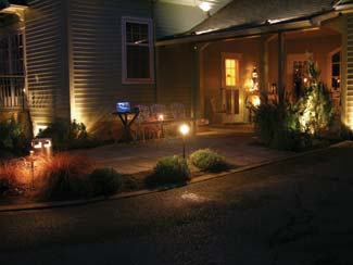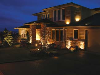 One important spot turned out to be a large cedar tree in the front yard in which the team mounted five Lunar fixtures to filter ?EUR??,,????'??moonlight?EUR??,,????'?? through the branches. The placement created a beautiful light-and-shadow pattern on the ground while illuminating the front walkway without using traditional path lights (conspicuously) along the walkway in the lawn. Several Pulsar and F125 fixtures were also used to uplight the tree. The configuration ended up giving the front yard and entry walk adequate light to negotiate entering the house without overwhelming a visitor.