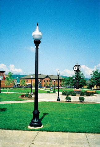 Knowing this was an old community, many of the adjacent buildings had been constructed in the 1920s and 1930s, Drake wanted to specify lighting that would blend into to the historic neighborhood. ?EUR??,,????'??Ordering these fixtures is like ordering off a Chinese menu–you can add or subtract the decorative tops, the actual collar that connects to the pole, the ?EUR??,,????'??roof?EUR??,,????'?? or top part of the globe, the cages–you can add decorative finials to make it more ornamental,?EUR??,,????'?? declares Drake. ?EUR??,,????'??As far as the poles, you select the height of the pole, the fluting, the base–you can really build from a basic catalogue of parts: You can build your own design.?EUR??,,????'??