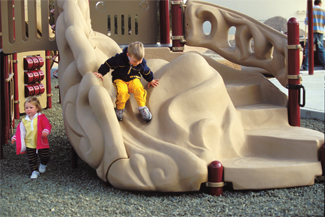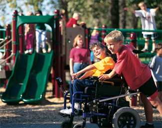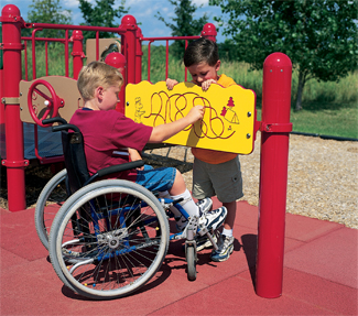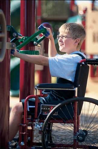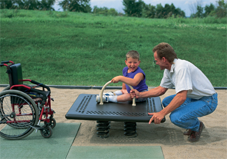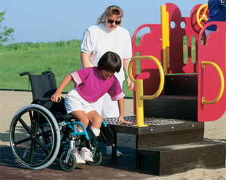 Twenty years ago few disabled children would have even contemplated playing with their able-bodied peers on a playground. The first problem was one of access: There was often no way for a child using a wheelchair, walker or crutches to get on or move through the playstructure. Back then there were no transfer modules, and few ramps. Loose-fill materials – pea gravel, wood chips or sand – encircled playstructures like moats, making wheelchair access impossible. And even when a playstructure did include a ramp, there was often no route of access from the nearest parking lot or sidewalk to the play area itself. To disabled children playgrounds might as well have been on the moon. For them, playground recreation involved watching others, hearing their laughs and getting a glimpse of their games, yet remaining detached and alone.