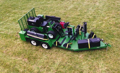The trailer package also includes a variety of attachments that all fit on the 12 ft. trailer. The attachments that are included with the 400 Series Trailer include a 5 cubic ft. and 10 cubic ft. bucket, 48" wide tiller, 3 ft. trencher, an 18" stump cutter, a 4 ft. boom for lifting trees, 30" fork lift, and a post digger with 9" and 18" augers. The trailer has custom brackets and 10 ton safety straps for the Power Trac machine and each attachment. Optional attachments that can be added to the trailer package include a 48" or 60" mower, 48" box blade, 60" blade, 4 cubic ft. fertilizer/salt spreader, and grapple bucket.