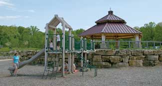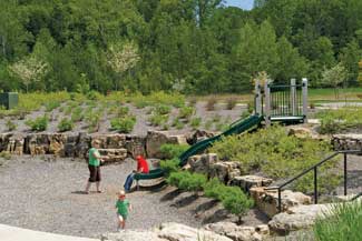The Eco-Playground play structure comprises a wood clatter bridge connected to the pavilion pad. Other elements are the Loop Climber, Chain Cargo Net Climber and Chute Slide with Enclosure. The play surface is engineered wood fibar mulch. The retaining wall is native Missouri weathered limestone ledge rock.