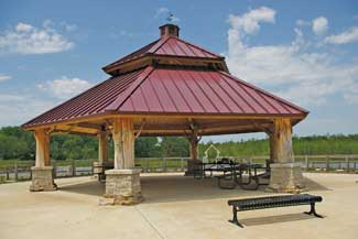 Reese Recreation Engineered Fibar Surfacing Timberform Play Stuctures: Playground Equipment DuMor???????(R)???? Site Furnishings Poligon Park Architecture, Large Central Pavilion (Custom Features were designed by SWT Design) Litchfield Landscape Elements, Park Shelters