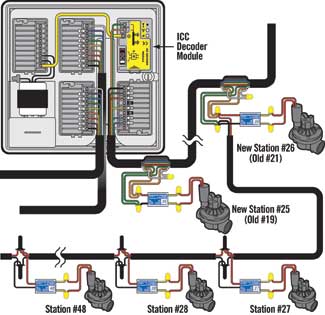 Some contractors prefer to set up an irrigation system in which one decoder/receiver operates two valve stations. In that case, up to 96 valves can be controlled by one 48-station ICC with two decoders per station.
