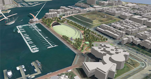 GBC also proposed projecting colors and images onto buildings that frame the harbor, synchronized geysers for the harbor and three concepts for a waterfront park at Rash Field. Designed by Ayers Saint Gross of Baltimore, the Rash Field plans call for beach volleyball courts, a playground and public art installations. One concept envisions a concert band shell at the east end and a large green space in the center, a-la Chicago's Millennium Park and the Pritzker Pavilion.