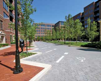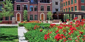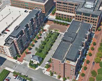 Landscape elements work in harmony with a strong design plan and provide physical and visual connections to the adjacent urban environment. The northern edge of the piazza and courtyard frames views, leads pedestrians and provides interesting texture to the neighborhood. The townhouses and their terraces border the courtyards and provide a layered effect from the private terrace to the public courtyard. Parking is accommodated in a structure concealed behind the residential fa?????ade.
