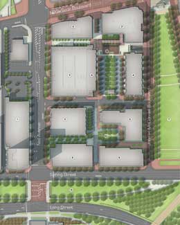 The area shown in the Burnham Square master plan is in Columbus, Ohio?EUR??,,????'?????<???EUR?s downtown Arena District, formerly home to the Ohio Penitentiary. The prison closed in 1983, but the complex stood vacant for more than 10 years before the state sold it to the city to make way for urban redevelopment. Private investment within the district has pushed beyond 500 million dollars in its 10-year history.