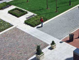 The recycled bricks and cobblestones are incorporated with new concrete cobble hardscape materials to create rich textural accents in the square?EUR??,,????'?????<???EUR?s courtyard. Burnham Square?EUR??,,????'?????<???EUR?s internal streets and sidewalks also use new hardscape materials of clay brick. The materials chosen complement the abundant green space in the courtyard and the large grove area.