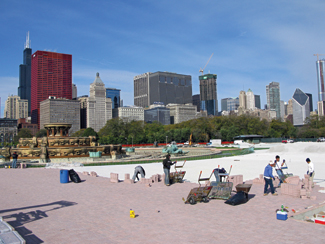 One of the major difficulties of installing the hardscapes for Buckingham Fountain was working through winter. Burling Builders began the project in the first week of September 2008 and ended in March 2009, so the company did most of the project during the harsh conditions of a Chicago winter. ''I would say that working through the winter was the most difficult challenge we faced,'' said Girzadas. ''Keeping the ground thawed and the work area cleared of snow and ice so we could continue the paver operation was quite a challenge.'' To address this problem, they used ground thaw machines, which have a radiant hose system that is spread on the ground, covered with blankets and sits on the ground for 24 hours to keep everything thawed.