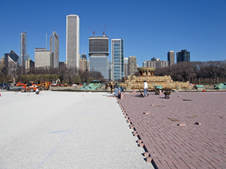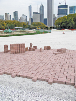 The Chicago Park District purchased the permeable pavers directly from Unilock, a paving stone manufacturer. The Eco-Priora Coral Gem pavers closely matched the original fountain paving color and appearance. ''There used to be crushed granite stone chips in the plaza that were pink in color, so the pavers were intended to mimic that,'' said Girzadas. ''They [also] wanted the permeable pavers set in a manner that the eye could not easily distinguish a pattern.'' All the pavers were hand set in a 5 ft. by 5 ft. block.