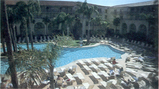 The colored concrete, which was used in the hotel, was repeated in the hardscape design surrounding the building. Pool decks, walls, paving and other garden-like hardscape was matched to the building color and, through the use of the same color, “gave the landscape designer variety and adaptability in design,” according to Ray Desselle, Orange County Office Manager for Emmett Wemple & Associates. The Orange County office is also using color additives to color concrete in Sun West Village in Hemet, California and at the Downtown Los Angeles YMCA, according to Desselle.