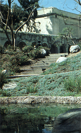The use of colored concrete is spreading throughout the country Concrete is still a quality material in almost every situation and, with the addition of color, it can be a most elegant material and one which will usually fit into the construction budget. The material will combine with other paving materials to form an interesting pattern and will, with texture added – as at the Ritz Cariton in Laguna Niguel – offer the landscape architect a most intelligent alternative to the use of much more expensive paving and other hardscape materials.