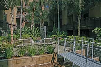 In keeping with the industrial character of the neighborhood, Pressman points out, ''A screen around the fireplace recalls industrial grates. The beams holding the ''grate'' are 'I' beams and the posts as 'T's.' Black slate tiles create the facing on the fountain as well as the bands on the walls and a seat wall that runs along the base of the planter. That seat wall was part of a requirement by the fire department to allow the firemen to step into the planters if needed. Because it was right up against the unit, the firemen needed access to the bedroom windows.