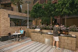 ''The barbecues are located on the corridor side of the kitchen. The base of that wall mirrors and ties into the fountain base in the next 'room.' A compact way of creating a sense of space was by breaking the area up into rooms, using walls and screens as dividers. This is actually a very efficient way to include all the amenities, which mirrors the way it's done with an interior space. By not being able to perceive the whole space at once, it looks bigger,'' Pressman says. ''By placing the 'rooms' on the diagonal, and not squaring them to the buildings, you can set up a dynamic quality and energy that animates the space even further. In addition, the curve of the wall fountain, and the curved base of the stone fountain, the semi-circular raised patio area and the curve on the pool become a judicious use of curves to balance the linear quality of the walkways.''
