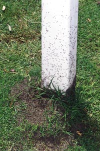 Mowing and disturbing ant mounds. Disturbing colonies frequently may cause the fire ants to move to a new location. In the landscape when the grass is mowed frequently at a low cutting height, the disturbed colonies will move to less disturbed areas in the fence row, adjacent to sidewalks and foundations or to hedge rows and trees. This is evident on putting greens and tees of golf courses as well. Fire ants are known as rapid reinvaders; they will rapidly reinvade the disturbed lands once these practices stop.