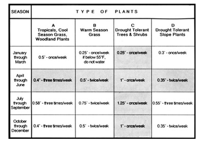 These schedules are for established plantings. When plants are installed from a nursery, they need more frequent, shallower irrigation. After the first summer, the plants can gradually be put on their permanent schedule. Also, after trees grow and their canopies get bigger, areas shaded by the trees will need less frequent, but deeper, irrigation.