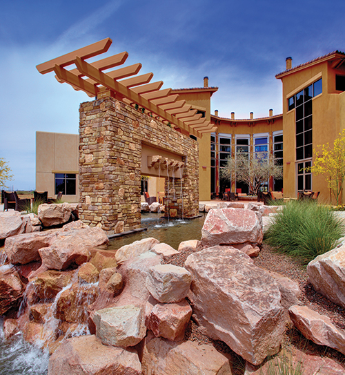 This Todd & Associates, Inc. project challenged contractor The Weitz Company, LLC to transform the Sagewood Senior Living Community in Phoenix, Arizona into a resort atmosphere. A key component of the desired character was the introduction of water elements to soften the desert Southwest setting. The cascading water feature is physically separated from the pool and is on a separate pumping system. All pumps and equipment are located in a remote pool equipment room as part of the pool building, which also including restrooms and an outdoor food service area. The challenge for this 300-plus-unit retirement community was to develop a series of water features with water conservation and minimal maintenance as a primary objective, while filling the area with the sound of water. These features were placed at areas of entry/arrival, to provide a backdrop in areas specifically designed to encourage social interaction. Major Water Features The project's major water features include the main street mixed-use area with a signature fountain, carrying the three-dimensional metal logo of Sagewood, at the arrival/entry plaza and port cochere. Water flows located between the independent living apartment buildings provide a focal point for the sound of water within the courtyard. The need to minimize the use of water for the internal courtyards is reflected in the "trellis" fountain at the commons terrace area overlooking the pool deck. Workers set all the rocks in place using a crane and front-end loader. With the exception of the "trellis" fountain overlooking the pool deck, all fountains have no above grade open reservoirs, which reduces the amount of water evaporation and keeps maintenance to a minimum. The "trellis" fountain, designed to carry a scarlet bougainvillea over its top, doubles as the water source for the swimming pool below; water cascades over natural granite boulders to the pool deck area. Workers plumbed the trellis fountain so that it doubles as the water source for the swimming pool below. The fountain runs on a separate pump system. Stones were used in combination with precast concrete to be compatible with the project building materials. The tower measures 4-feet across and 8-feet high. Construction involved preparation of the concave concrete basin and rolled edge in conjunction with installing water and electrical access from the underground parking immediately below. Flush mount lights were also installed in the basin surface to illuminate the scupper tower from all sides. A single water reservoir was installed within the tower to ensure equalized flow through the eight scuppers. The hardscape for the pond fountain was constructed of CMU, atop which workers added faux stone veneer and precast concrete lentils with scuppers. The company treated the pond basin to gunite covered with black Pebbeltech finish. Workers set the natural granite seating boulders into the concrete deck and adjacent landscape beds using a skid-steer.