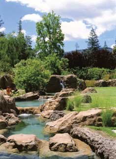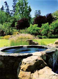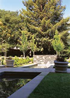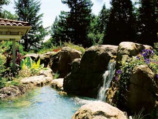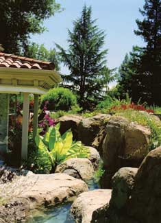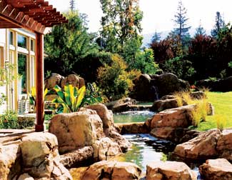 Water turned out to be a key element for a home in Saratoga, near San Jose, Calif., turning it into an enchanting resort, retreat and home base for a client who travels weeks at a time across the globe. The client, an international executive, spends so much time away that his idea for a home landscape is that it be as peaceful and restful as possible?EUR??,,????'??+while reminding him of his youth in a more tropical climate. The single-acre site gently slopes from front to back and has views of the hills beyond. The new home is designed in a classic, single-story style of architecture.