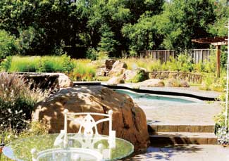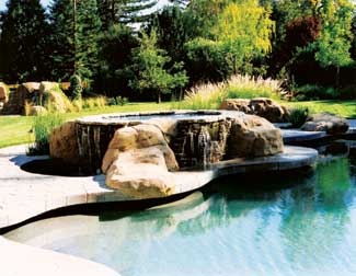 The glass shower is enclosed with a manufactured rock wall with planting pockets that hold ferns, grasses, morning glory, jasmine and bougainvillea. The wall was designed to create privacy, letting the owner bathe in ?EUR??,,????'??the outdoors?EUR??,,????'??. The planted rock wall along with the boulders and rock outcroppings were created by a manufactured rock company (Cemrock) from out of state. They came for two weeks, built frames, laid conduits, placed concrete, textured the gunite and colored during that time. It was an impressive display of expertise and creativity with a medium that can be difficult even under the best of conditions.