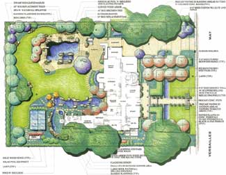 The rear yard is a series of landscape elements linked by a system of axis, or connecting lines. A traditional Japanese alignment technique was used to create order out of this informality. The spaces were to relate to one another, yet seem informal in their arrangement. An outdoor entertaining patio, lookout patio, private retreat, ponds, pool and spa waterfall all interact with one another on the property. The series of informal axis allowed all of these items to visually or functionally connect.