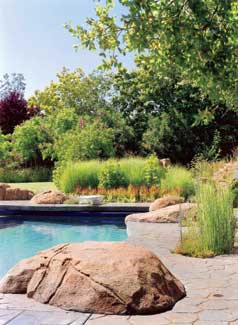 The water features are the most striking feature of the rear yard. They help to create, along with the plantings of 14 types of grasses and lush foliage, the restful vacation-like effect the client was hoping to create. The boulders, waterways, pool and spas are laid out respecting traditions of balanced asymmetry, compositional massing and 3:5:7 principles. Using these borrowed Japanese design techniques helped to bring together the disparate pieces into a peaceful, cohesive whole. All the water elements are laid out on this informal axis principle.