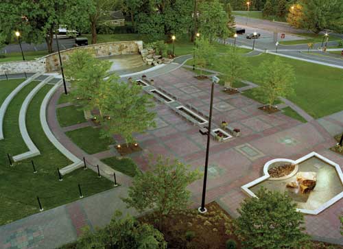 The hardscape design draws inspiration from the local Amish quilting tradition, while the fountains take their design cue from the area?EUR??,,????'???s stone masonry heritage. Of the five key design components ?EUR??,,????'??? Alumni Walk, Campus Green, Alumni Plaza, Our Future Pavilion and Main Street ?EUR??,,????'??? Alumni Plaza is the focal point of the project. With its combination of fixed and fluid surfaces and a mesmerizing water feature, the design invites participation and contemplation. When the water is turned off, the plaza serves as a stage for large gatherings and performances.
