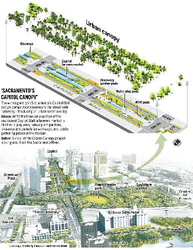 Boston-area landscape architect Kimberly Garza and colleague Andrew ten Brink of New York were named winners of an international competition to redesign Sacramento?EUR??,,????'?????<???EUR?s lackluster Capitol Mall streetscape. The team won a $20,000 first prize for their re-imagining of the mall's sidewalks and medians as an urban forest, populated by native oaks and pine trees, and studded with event sites, including an amphitheater and farmers market. Garza said the concept, called ?EUR??,,????'?????<?Sacramento?EUR??,,????'?????<???EUR?s Capitol Canopy,?EUR??,,????'?????<? recognizes the ecological and human health benefits of bolstering the city?EUR??,,????'?????<???EUR?s green canopy. ?EUR??,,????'?????<?The urban forest in Sacramento is in decline,?EUR??,,????'?????<? Garza said. ?EUR??,,????'?????<?That means increased heat island effect, and increased pollution. There needs to be a strategy in place that responds to that.?EUR??,,????'?????<? Garza, a graduate of the Natomas Charter School Performing and Fine Arts Academy, as well as UC Berkeley and Harvard University, teamed with ten Brink to beat 39 other contestants, including several from outside the United States, officials said. The competition was co-sponsored by the city of Sacramento and the local architect group AIA Central Valley. Jury member Bill Crouch, the city?EUR??,,????'?????<???EUR?s urban design manager, called the Garza and ten Brink entry ?EUR??,,????'?????<?a lovely design?EUR??,,????'?????<? that made sense downtown. ?EUR??,,????'?????<?We felt it was believable and doable,?EUR??,,????'?????<? he said. ?EUR??,,????'?????<?It resonated as a design that understood its context.?EUR??,,????'?????<? The design maintains open site lines between the Capitol building and Tower Bridge. The mall's center medians remain in place, but are turned into spaces where people can shop and frolic, including a marketplace and children's water play zone. To add more event room, the street is narrowed in some places to one lane in each direction. The design also turns Crocker Park into a sculpture garden and adds an amphitheater on the south side of Capitol Mall near the freeway. It includes a pedestrian bridge over the freeway, and creates a riparian canopy along the Sacramento River.