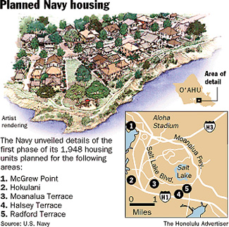 Hawaii Military Communities is negotiating with the Navy for the first project phase of 1,948 units. The cost is estimated at $358 million for construction, renovation, demolition, and for the community centers, landscaping and street improvements.