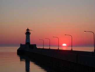 Sunrise over Lake Superior from Canal Park, one of the ?EUR??,,????'??jewels?EUR??,,????'?? of Duluth, designed by landscape architects.