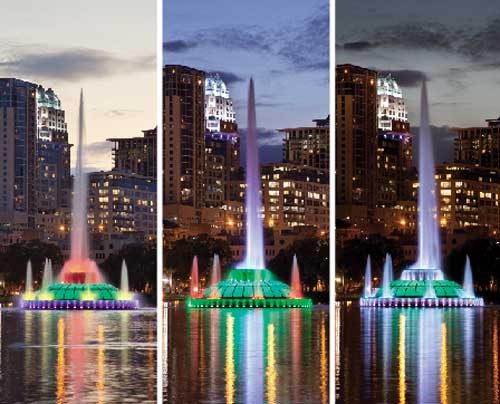 The city desired energy-efficiently lighting choreographed to water effects and tied into the park-wide audio system. In short, a stunning nighttime lightshow of water and music. Orlando wanted to be wowed. To sync the shore-side animation and DMX (digital multiplex) controllers, and the lighting and control equipment on the fountain, a fiberoptic communication cable was installed along the lake bottom. A strictly adhered to detailed management plan enabled the project to progress nicely and remain on budget despite a tight completion schedule.