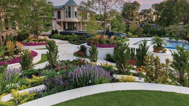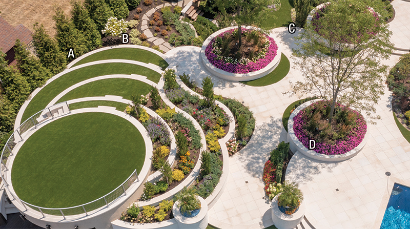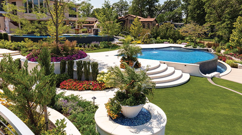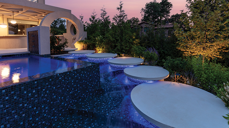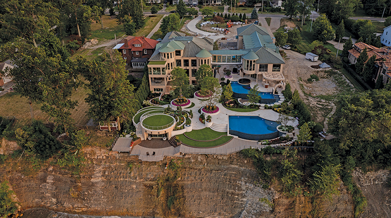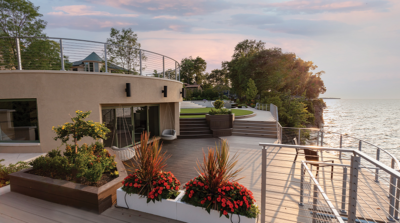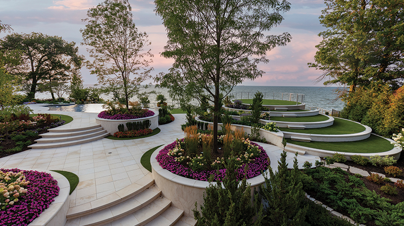 Set along a dramatic, forty-five-foot cliff in the Great Lakes Region, Lakeside Lifestyle reimagines waterfront living as a fully immersive, resort-caliber experience. Designed and built by Ohio-based luxury landscape architecture firm Cloonan Design Services Inc., the project transforms a private residence into a layered outdoor environment where landscape, architecture, and water are inseparable. Beyond crafting an environment for everyday use and hosting, the goal was to create a sense of openness and ease often associated with world-class waterfront destinations. Standing above the upper pools provides an uninterrupted view to the lake due to vanishing edges on all three pool elements. The upper living area features lights in the larger pool - which is a consistent 52 inches deep - as well as under the coping around the spa, creating a unique glow effect. In the nearby outdoor kitchen, LED color-changing strip lighting was used to complement the white granite countertops. Setting The StageAt the start of the design process, the homeowner wanted a rectilinear design. The Landscape Architect drafted two concepts to reflect these wishes but felt strongly about creating a design that would respect the fluid nature of the lake and landscape. So, a third concept was formulated featuring a curvilinear/circular design that differed greatly from the other two. When the client reviewed the three concepts, he overwhelmingly approved of the curvilinear design. Unbeknownst to the design team, the interior of the home featured multiple round motifs as well as curved stairs, making a strong aesthetic connection between the two. Once the construction process began the design team worked closely with the homeowner, who allowed various changes to be made as challenges arose. Nestled between planters and the cascade retaining wall of the upper pool, this fish-eye-shaped, private living room features a 60-inch concrete fire bowl. Outfitted with composite decking, this space was intentionally closed off from the rest of the backyard to protect users from the wind and to provide a more intimate area. Most clients desire the lake views to be completely wide open throughout the property, but the client agreed to including view barriers in order to create depth of interest. While the lake will always be an exciting feature, it is even more exciting to catch a glimpse of it around elements like planters and large trees, culminating in a sense of arrival once the cliffside deck finally opens up to reveal the watery expanse beyond. Because most of the upper levels of the property were filled with programmed "rooms," the wide-open views along the deck are accompanied by large, flexible spaces on the deck and synthetic turf lawns. Added for its calming acoustics and dramatic nighttime effect, a cascading waterfall features large, circular, pre-cast concrete steppingstones along its path to the outdoor kitchen. Lights from underneath tie the element to the adjacent pools while illuminating the running water, unique staircase, and the various hues of blue tile.