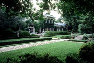 Embracing a series of outdoor rooms relating to the home’s Old World architectural style, the one-acre estate aesthetically blends a complex assortment of plants ranging from warm and cool season turfs, extensive mixed vines and ground-covers, carefully selected color, formally maintained shrubs, specimen plantings and established trees that require horticultural expertise and sensitivity.