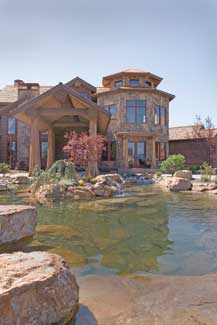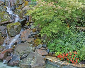 Landscape architect Clayton Varick RLA worked with a senior designer Kathy Swehla to deliver a design worthy of this lodge-style home crafted of natural materials. Estimating, presentation and overall project management were the responsibility of the landscape architect. Design of the water feature’s hydraulics and overall construction observation and guidance were also part of the design team’s role. Day-to-day decisions were made to deal with unforeseen problems, control quality and ensure the project was completed in a month-and-a-half time frame. The project included all landscape design work and the completion of soil work, irrigation, water features, drainage, rockwork, planting, soft paths and hardscapes.